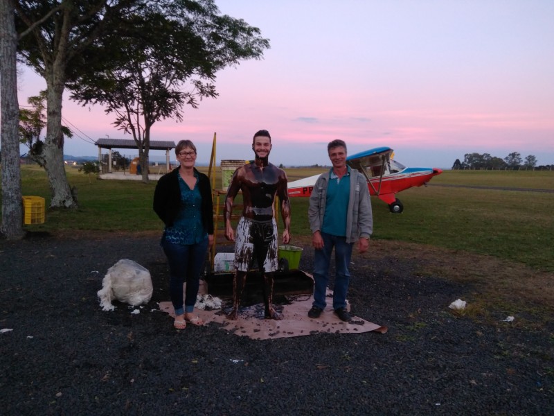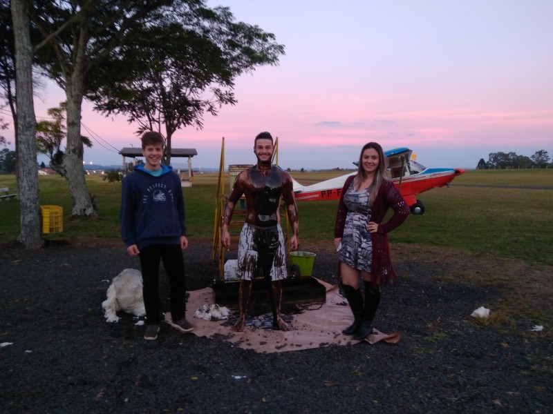 Para celebrar ele recebeu de seus familiares e de seus instrutores de voo André Nickel e Gabriel Landro Pizarro um banho de óleo que sinaliza a recente conquista.